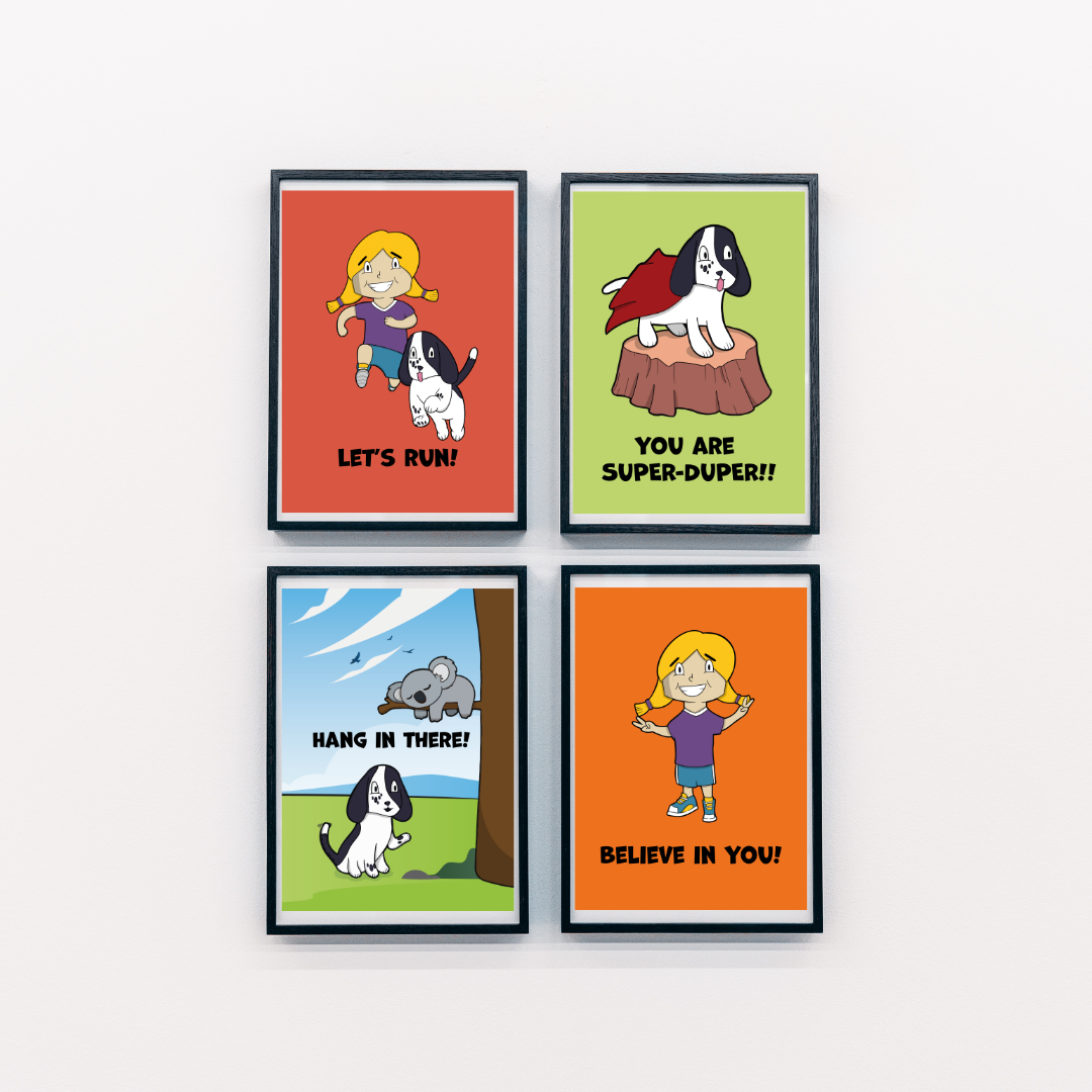 This bundle includes all 4 uplifting postcards and both A3 posters β featuring bold characters, motivational quotes, and rhymes from The Girl That Loves To Run.